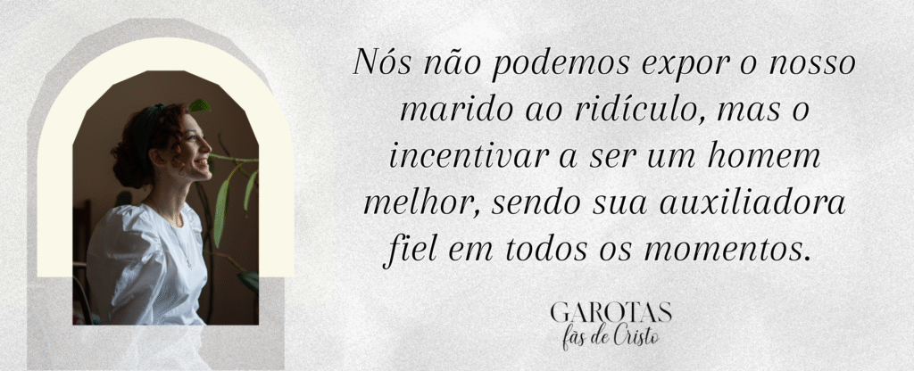 Nós não podemos expor o nosso marido ao ridículo, mas o incentivar a ser um homem melhor, sendo sua auxiliadora fiel em todos os momentos. O respeito que o marido recebe “nas portas da cidade” é, em grande parte, reflexo do apoio e da sabedoria que ele encontra em casa.